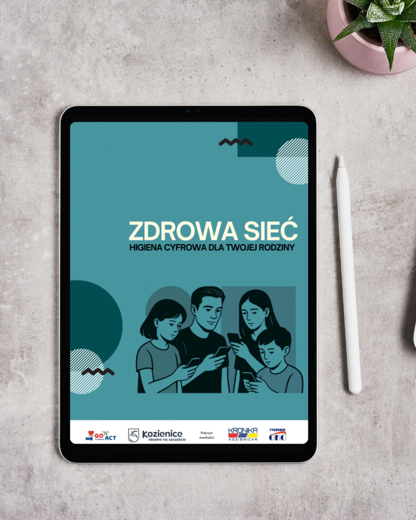 Publikacja „Zdrowa sieć – higiena cyfrowa dla Twojej rodziny” kierowana jest głównie do rodziców, a część z jej elementów powstała na warsztatach z dziećmi i młodzieżą z Gminy Kozienice: uczniowie analizowali swoje nawyki ekranowe oraz sposoby na świadome używanie internetu – tak, by nie zabierał nam czasu na to, co jest dla nas uzdrawiające oraz ładujące nasze baterie. Wspólnie zastanawialiśmy się także nad dobrymi i złymi stronami poszczególnych gier, a także social mediów, Youtube’a, komunikatorów czy Chata GPT.
